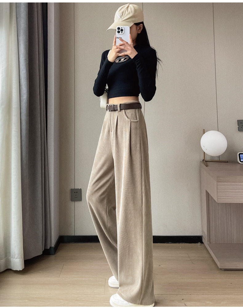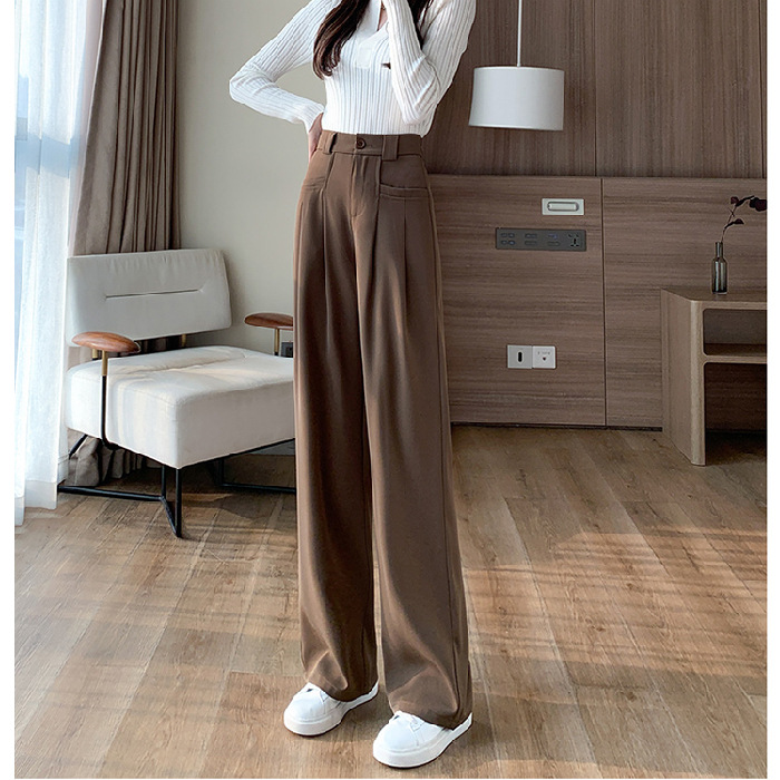 ハイウエスト設計のベージュワイドパンツは、脚長効果抜群で美しいシルエットを演出します。