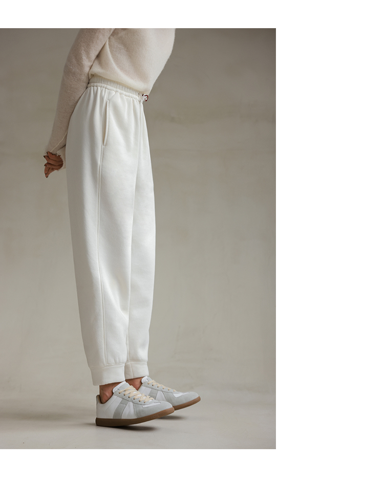 ニット素材で季節感たっぷり 裾リブデザインのベージュパンツ 様々なトップスと相性良好